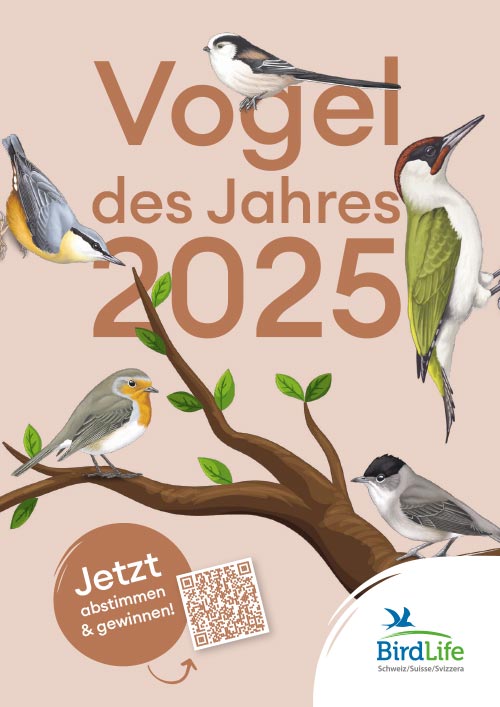 Wer sein Nachfolger wird und 2025 als 25. «Vogel des Jahres» diesen Titel tragen darf, wird erstmals von der Öffentlichkeit bestimmt. Zur Auswahl stehen Grünspecht, Kleiber, Mönchsgrasmücke, Rotkehlchen und Schwanzmeise. Bereits über 7000 Personen haben sich an der Wahl beteiligt. Aktuell führt das Rotkehlchen mit einer hauchdünnen Mehrheit. Wer also seinem eigenen Favoriten noch zum Durchbruch verhelfen möchte, sollte die Abstimmung nicht verpassen! Für einmal ist die elektronische Stimmabgabe sehr erwünscht: alle notwendigen Informationen finden Sie bei BirdLife Schweiz oder unter www.vogeldesjahres.ch.