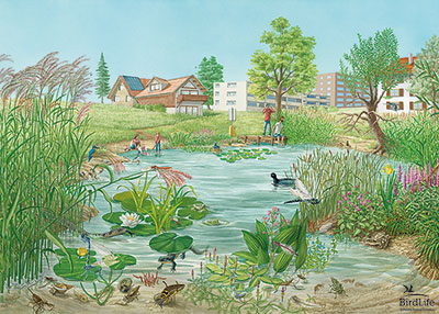 Dieses wunderbare Poster zeigt den Lebensraum Teich im Siedlungsraum. Anhand von typischen Tier- und Pflanzenarten wird das Habitat vorgestellt. Dickes Papier, Grösse A1 (59,4 x 84,1 cm). Zu den Postern wird ein Beiblatt mit den Artnamen mitgeliefert. Preis exkl. Porto/Versandmaterial (zusammen Fr. 11.–). Lieferfrist mindestens 2 Wochen (Einzelanfertigungen).