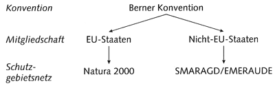 Die Umsetzung dieser Idee erfolgt jedoch in EU- und Nicht-EU-Ländern unterschiedlich. Das Programm, mit dem die Idee eines paneuropäischen Schutzgebiets-Netzwerks in den EU-Staaten umgesetzt wird, nennt sich "Natura 2000", das analoge Programm für Nicht-EU-Staaten ist "Smaragd".