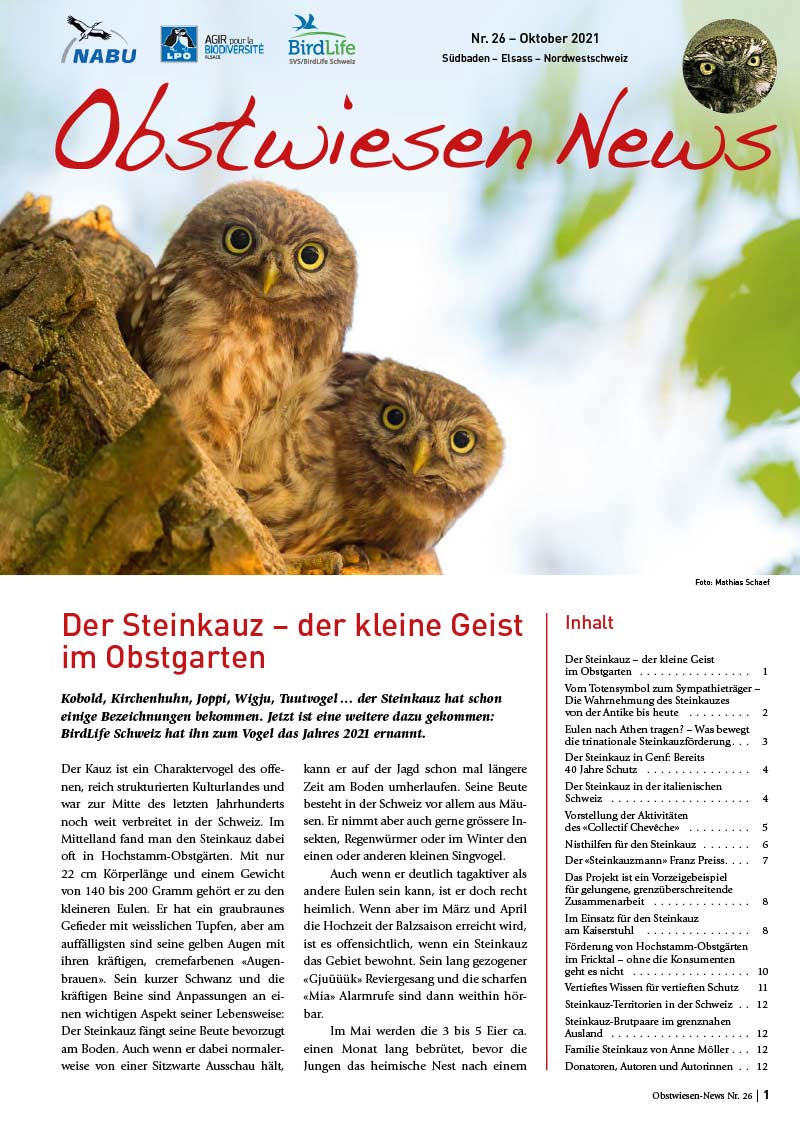 Die "Obstwiesen-News" berichten regelmässig über den Zwischenstand des Trinationalen Steinkauzprojektes.