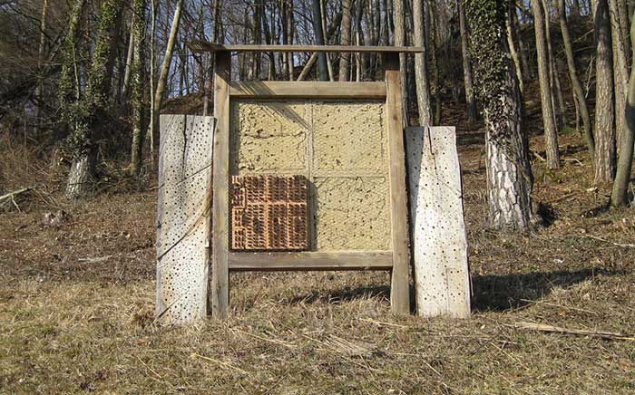Es braucht dazu abgelagertes entrindetes Hartholz, z.B. Esche Buche, Eiche. (Keinesfalls Nadelholz, wegen dem Harz). Ganz wichtig ist es, in das Längsholz zu bohren und nicht in das Stirnholz, also dort, wo ursprünglich die Rinde war. Bohrweiten von 3-6 mm sollten überwiegen, 8-9 mm oder 2-4 mm sind auch sinnvoll. Abstände dazwischen circa 2 cm. Die Gänge sollten 5-10 cm tief sein, dahinter muss noch mindestens 3-5 cm Holz sein. dh. ein Stück Holz sollte mindestens 15 cm dick sein. Wichtig sind glatte, saubere Bohrgänge, auch die Holzoberfläche muss nach dem Bohren mit feinem Sandpapier geglättet werden, damit die Nesteingänge nicht durch vorstehende Fasern versperrt werden. Risse im Holz müssen vermieden werden, da sie oft dazu führen, dass die Brut entweder geräubert wird oder verpilzt. Man kann auch dickere tote Äste oder Stämme senkrecht neben das Wildbienenhaus stellen.