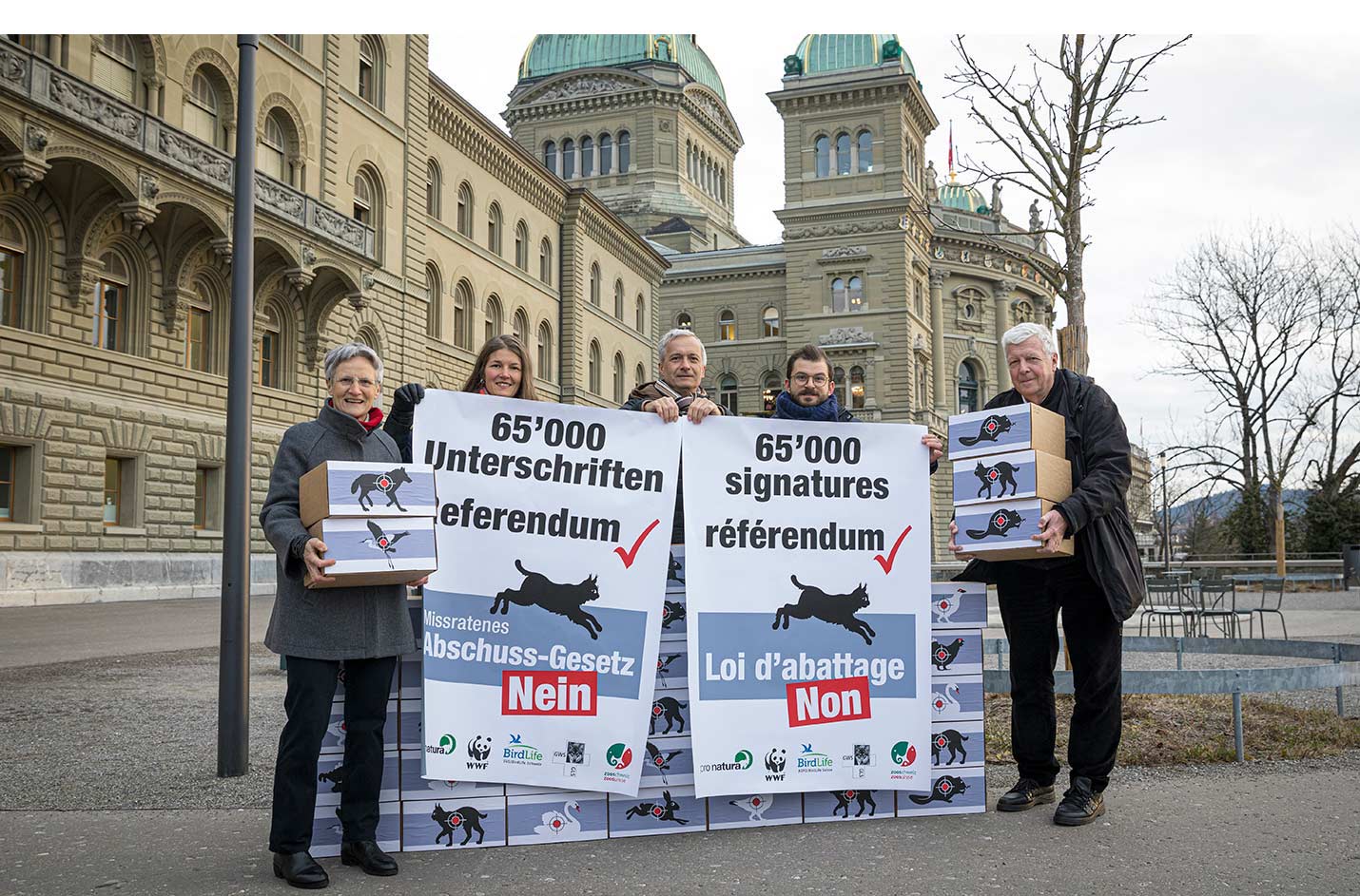 Les associations BirdLife Suisse, le Groupe loup suisse, Pro Natura, WWF Suisse et Zoosuisse n’ont pas souhaité le référendum contre la loi sur la chasse. A plusieurs reprises, elles essaient de persuader le Parlement d’adopter une révision équilibrée de la loi. Sans succès. Début 2020, les signatures nécessaires sont alors déposées pour le référendum. A la fin, un non certes serré, mais quand même net à cette loi sur la chasse ratée sort des urnes. Cela aplanit le chemin vers une meilleure révision de la loi, vraiment équilibrée cette fois-ci. (A gauche sur l’image : Suzanne Oberer, présidente de BirdLife Suisse)