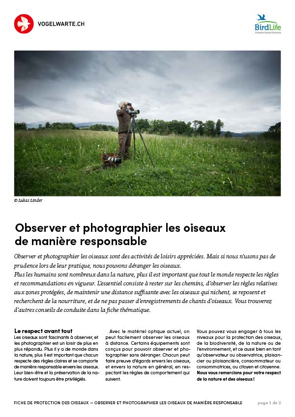 Les oiseaux sont fascinants à observer, et les photographier est un loisir de plus en plus répandu. Plus il y a de monde dans la nature, plus il est important que chacun respecte des règles claires et se comporte de manière responsable envers les oiseaux. Leur bien-être et la préservation de la nature doivent toujours être privilégiés. Cette fiche décrit le code de conduite de BirdLife Suisse et de la Station ornithologique suisse. A4, 2 pages