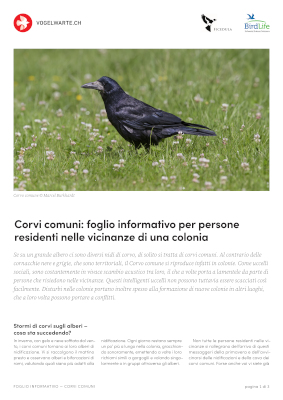 Se su un grande albero ci sono diversi nidi di corvo, di solito si tratta di corvi comuni. Al contrario delle cornacchie nere e grigie, che sono territoriali, il Corvo comune si riproduce infatti in colonie. Come uccelli sociali, sono costantemente in vivace scambio acustico tra loro, il che a volte porta a lamentele da parte di persone che risiedono nelle vicinanze. Questi intelligenti uccelli non possono tuttavia essere scacciati così facilmente. Disturbi nelle colonie portano inoltre spesso alla formazione di nuove colonie in altri luoghi, che a loro volta possono portare a conflitti.