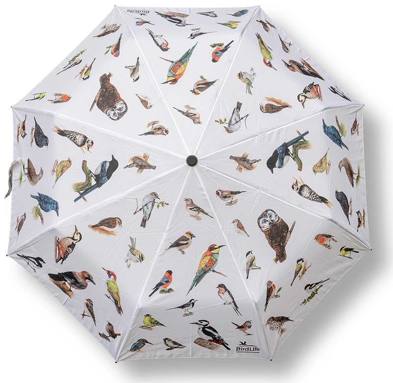 Con l'ombrello Eco di BirdLife siete perfettamente protetti dall'acqua e al tempo stesso potete ammirare i disegni di uccelli di Nina Waser. Questo ombrello pieghevole tascabile resiste anche ai colpi di vento. È prodotto in maniera ecologica con PET riciclato. Il CO2 del trasporto è stato compensato. Dimensioni: 98 x 56 cm, 8 segmenti, 365 g. Manuale, con manico in legno e cinturino per il trasporto.